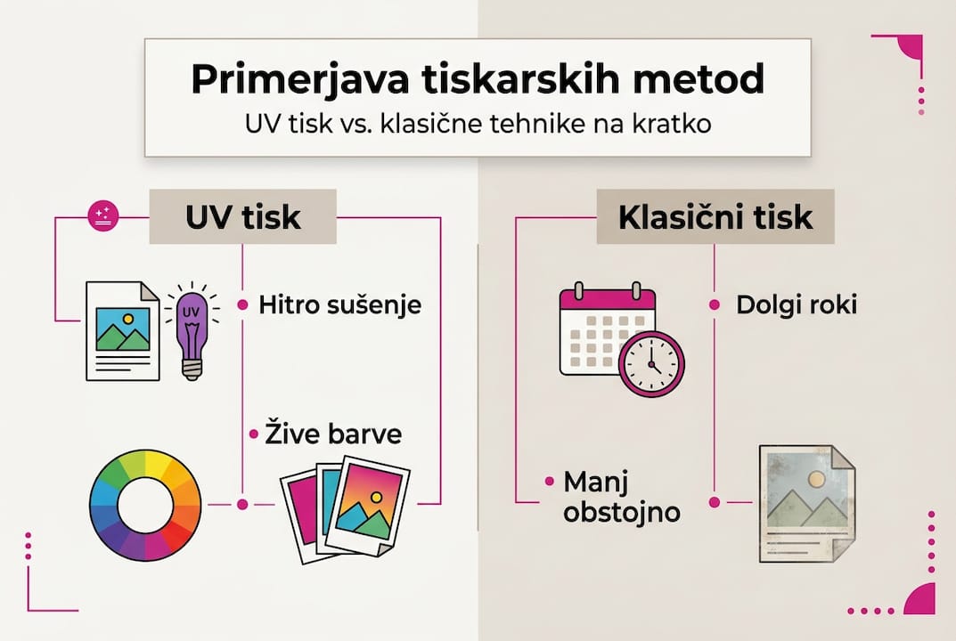 Strokovni nasvet: Ne zanašajte se na eno samo metodo za vse projekte. Najboljši rezultati nastanejo z izbiro prave tehnologije za vsak specifični namen. Za trajne zunanje aplikacije izberite UV tisk, za velike naklade brošur offset, za hitro personalizacijo pa digitalni tisk.